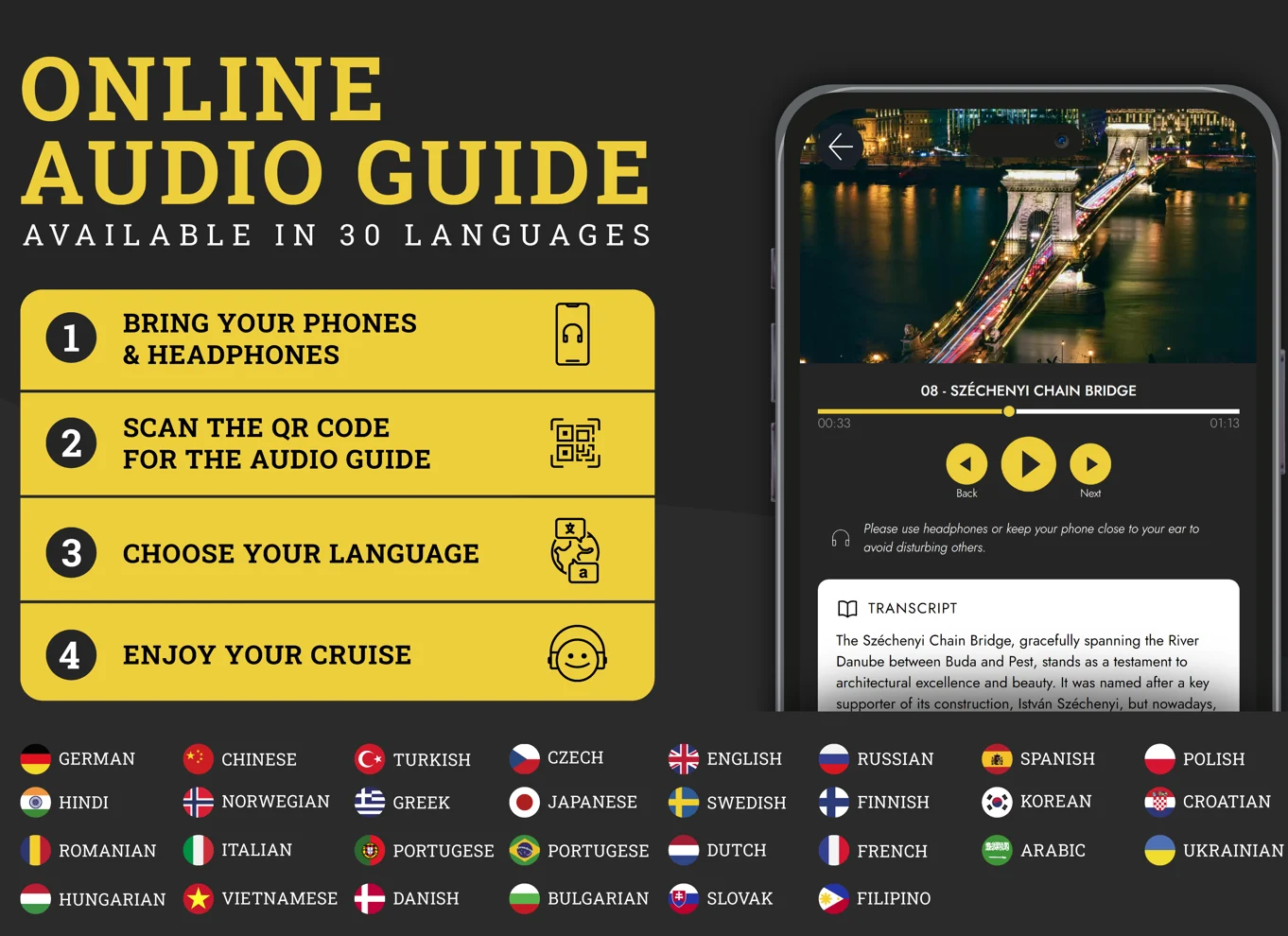 Der Audioguide ist über einen QR-Code an Bord verfügbar und kann auf deinem Handy genutzt werden. Er enthält sowohl hörbare als auch lesbare Inhalte in 30 Sprachen, um deine Reise zu bereichern. Für das beste Erlebnis bring bitte dein eigenes Handy und deine Kopfhörer mit. Wenn du Hilfe brauchst, helfen dir unsere Mitarbeiter gerne weiter.