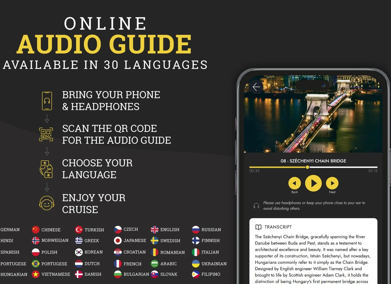 L'audioguide est accessible via un code QR à bord et est conçu pour être utilisé sur votre téléphone. Il comprend du contenu à écouter et à lire en 30 langues pour enrichir votre voyage. Pour une expérience optimale, nous vous prions d'apporter votre propre téléphone et vos écouteurs. Si vous avez besoin d'aide, notre personnel se fera un plaisir de vous assister.