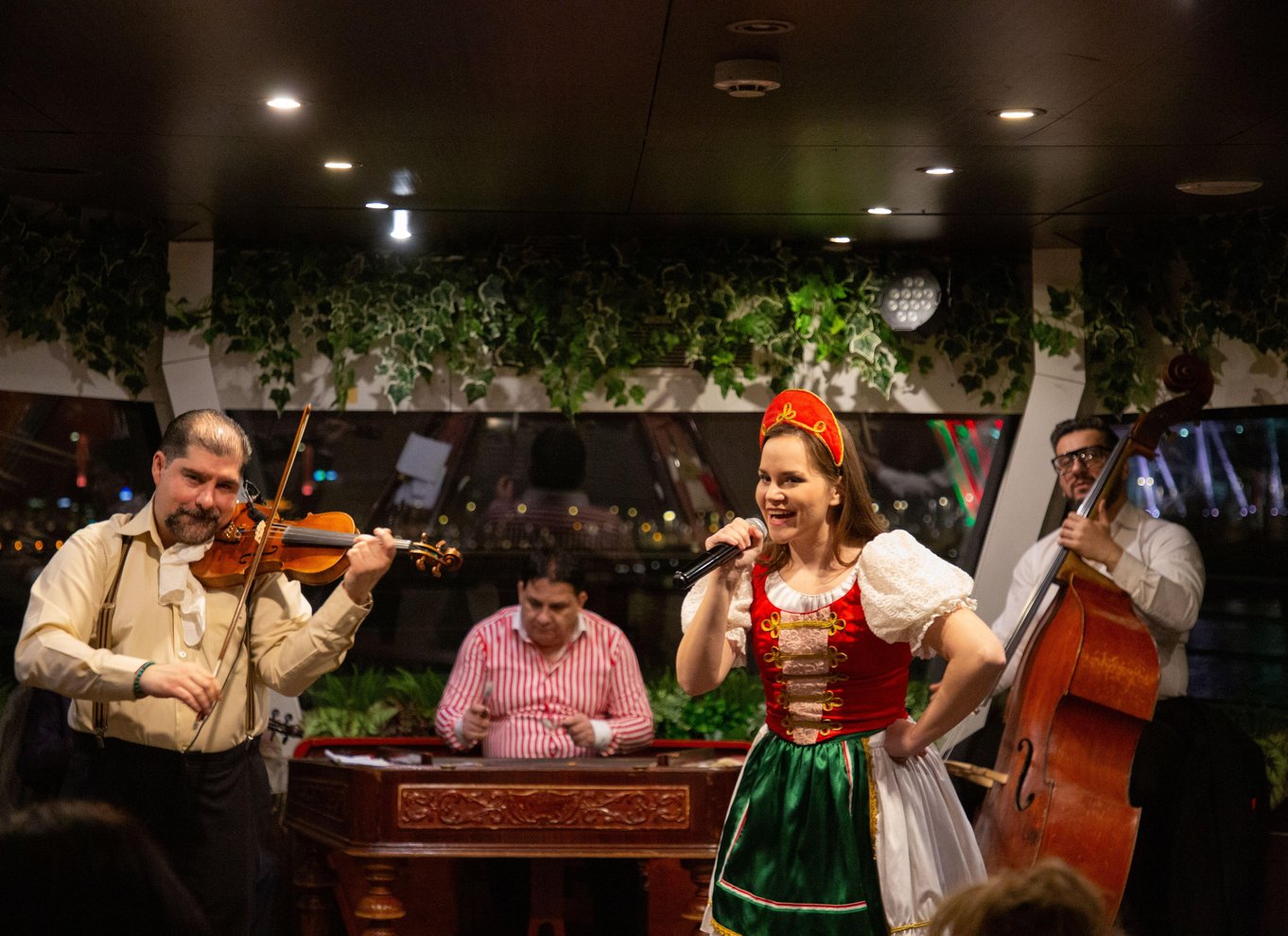 Ammira le attrazioni di Budapest su questa crociera sul Danubio. Ascolta come suona una band di musicisti e osserva come si esibiscono ballerini folcloristici vestiti con costumi tradizionali ungheresi.