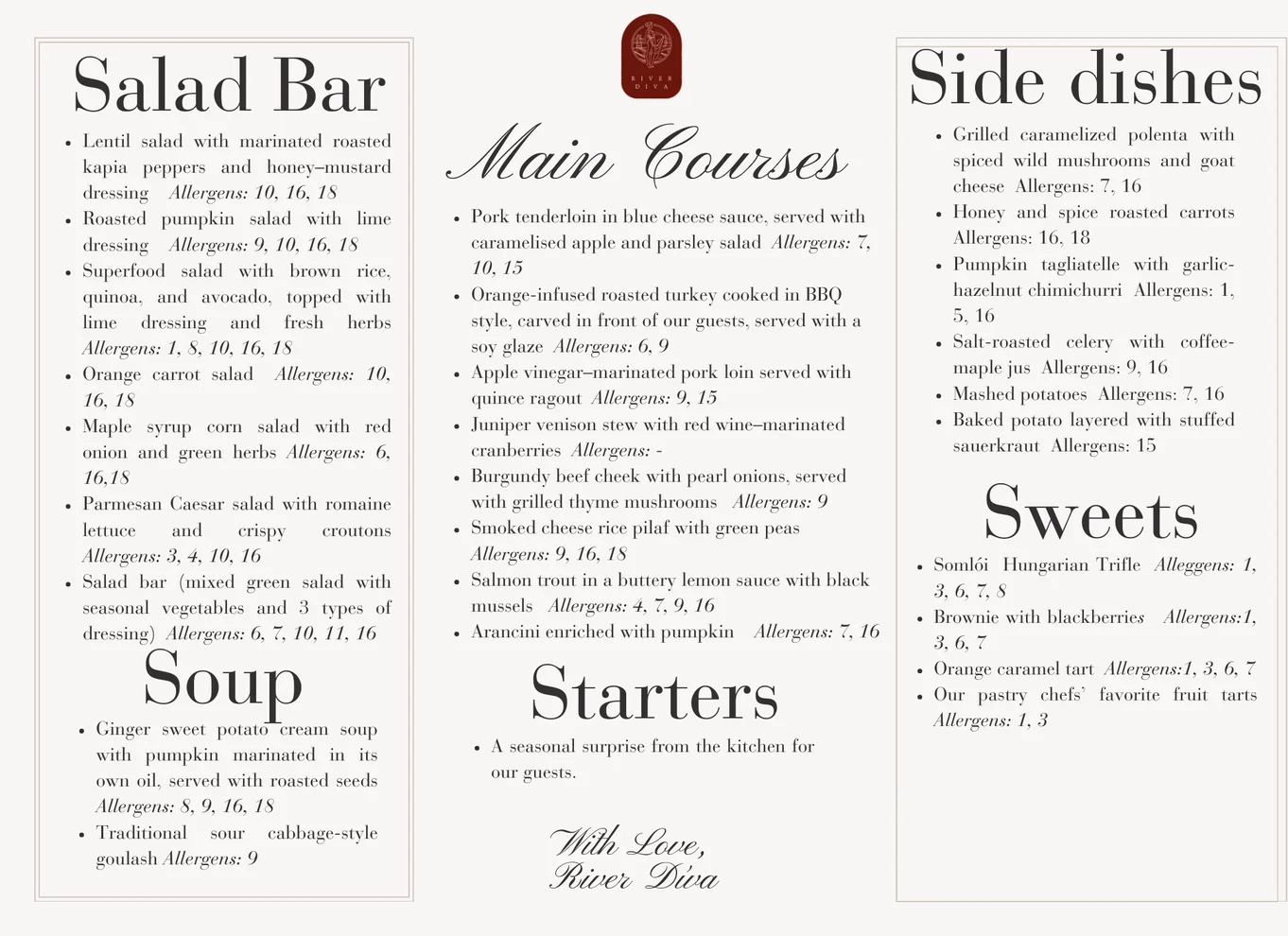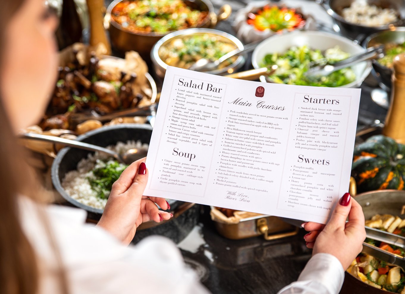 Savurează un meniu rafinat, selecționat de bucătar-șef, creat în bucătăria spectacolului. Răsfață-te cu o selecție atent pregătită de mâncăruri de sezon, realizate din cele mai bune ingrediente, concepute pentru a-ți încânta cerul gurii.
